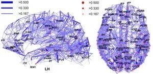 图1:大脑连接性的网络表示,其中枢纽被突出显示