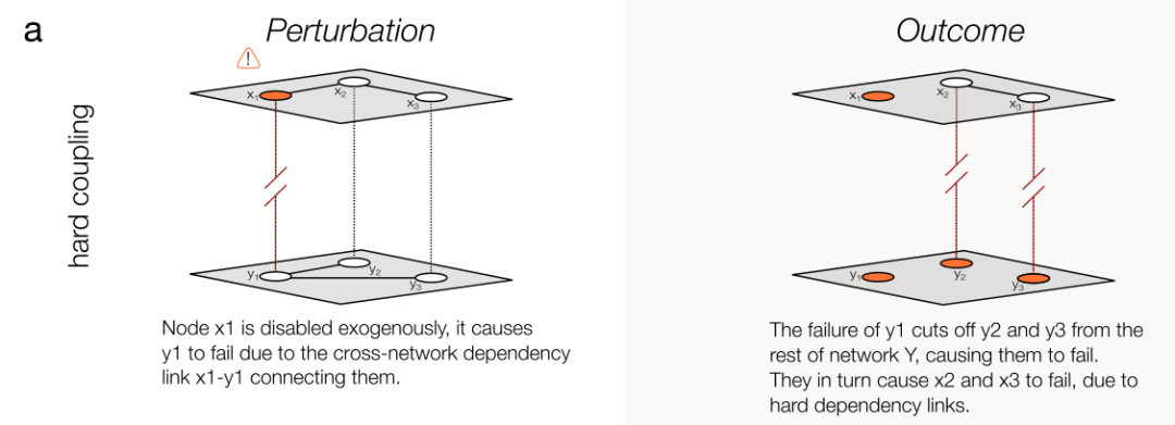 现有多层网络建模框架背后的常见假设是硬耦合(hard interdependence)。其中某个网络中的节点或边失效会导致其他网络中的节点或边失效,这反过来可能导致原始网络中的更多故障,从而引发跨系统的“多米诺骨牌式”的级联失效。例如图 1,X网络中的x1节点失效,导致与其相连的Y网络中y1节点失效,故障逐个节点传播,最终X和Y网络间所有连接失效。但事实上,并没有足够的、令人信服的真实案例能支撑这种多层网络级联失效模型。