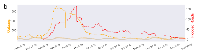研究者还考虑了时间因素,检查了同一区域过去60天内上报的停电恢复时间(如图8e)。结果表明停电恢复过程的放缓主要集中在受淹道路的周围时空内:虽然距离受淹道路30公里以外的停电95%以上都可以在10小时内得到修复,但距离受淹道路5公里以内的停电有40%的可能性在10小时后仍未修复。如图8e所示,在离被淹道路不同距离处观察到的“未恢复设施占比曲线”提供了多层恢复耦合的直接证据,说明了非电力基础设施的损坏如何影响电力基础设施的功能。