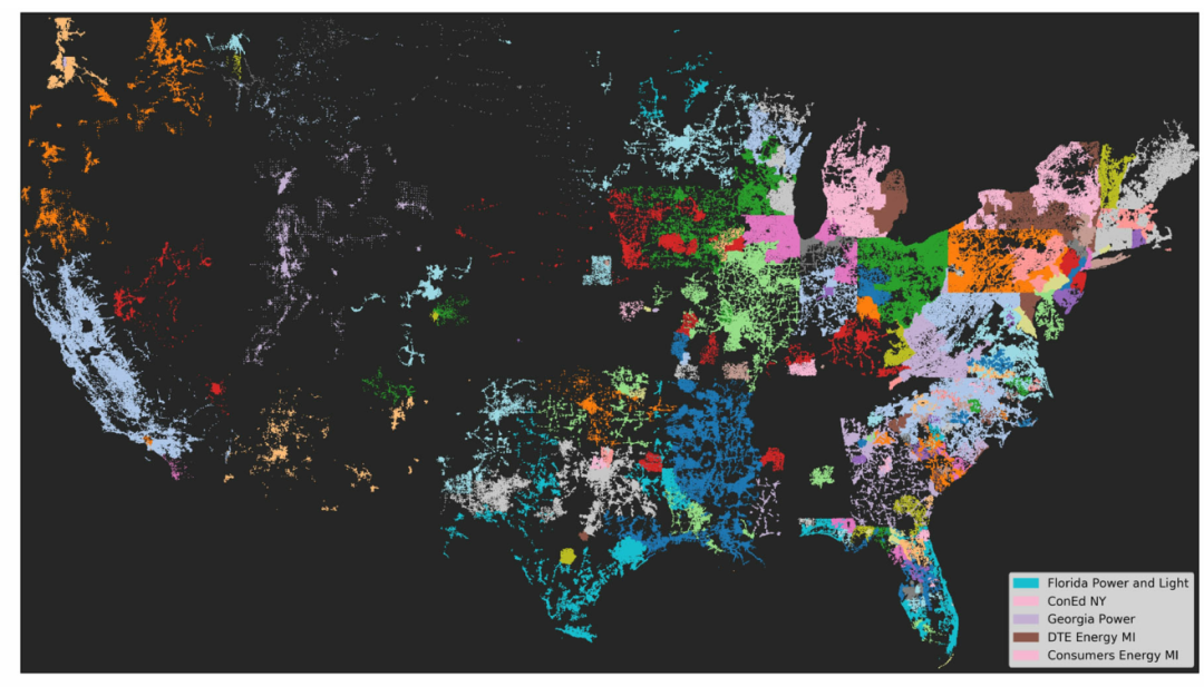 图3. 停电观测站所记录的停电位置,由服务于该区域的公共事业公司进行着色。
