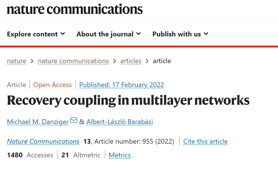 关键基础设施系统的复杂性和相互依赖性日益增加。例如,通信系统需要从电网中获取电力,而电网的运行和维护也依赖于通信系统。但是网络的修复需要往往也需要由其他网络提供资源,从而引发恢复过程中的相互依赖性。近日,美国东北大学网络科学研究所M. Danziger与A-L Barabási在Nature Communications上发表了一项研究中考虑了多层网络中恢复耦合关系,利用数百万次停电数据将恢复耦合的作用与其他因素进行区别,提供了恢复耦合如何影响系统功能的直接证据。