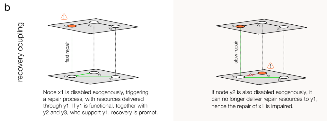 目前,少有研究针对多层网络中的恢复耦合关系。如图 2 所示,X网络中的x1节点失效,与其相连的Y网络中y1节点对x1”开展救援”,同时节点y2和y3也“补给”y1以避免系统瘫痪。如果支持网络(support networks)没有充分发挥作用,那么关键的恢复过程将会延迟或是停滞。这种情况更加贴近现实,例如恢复故障电源组件需要维修人员使用交通工具(交通网络)、通过通信(蜂窝网络和互联网)进行协调。某处的道路堵塞或互联网中断不会导致停电,但可能会延迟受影响地区的电力修复。