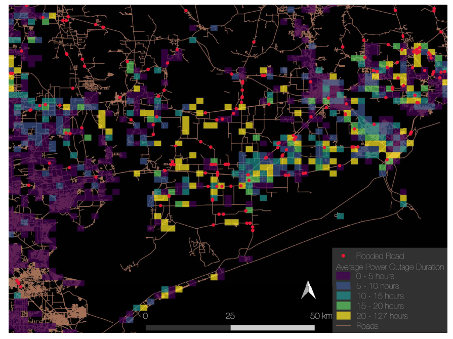2019年9月,热带飓风伊梅尔达在休斯顿及其周边地区造成大范围停电和洪水(如图6、7)。研究分析了水淹道路附近所有停电事故的持续时间,将区域是否被淹作为控制变量,从而测试停电恢复过程的延迟是由于系统范围内对资源的消耗,还是由于恢复率对道路网络的依赖。