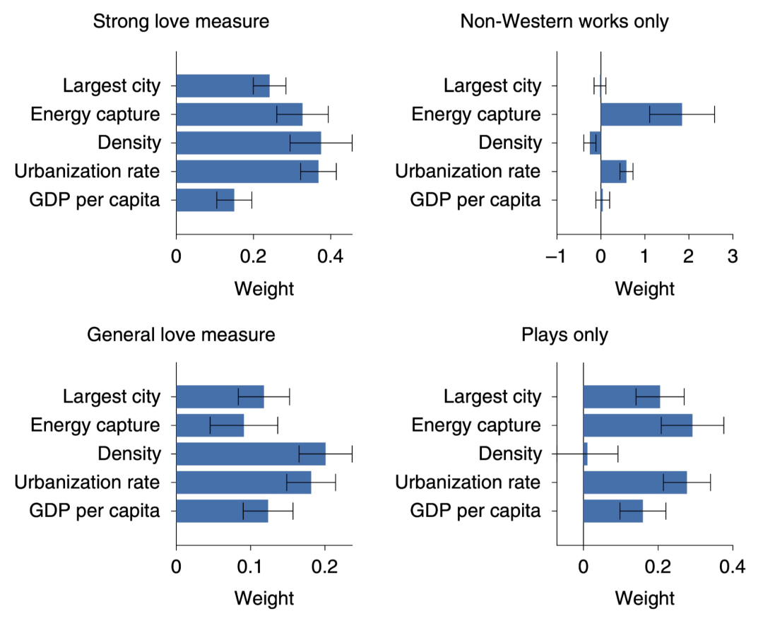 研究者还以经济发展的五个代理指标:人均GDP、城市化率、人口密度、能源获取和最大城市规模,作为回归变量进行了回归分析(广义线性模型GLM),结果表明,所有五个富裕度的代理变量都积极预测了数据集中当时代作品的浪漫内容。
