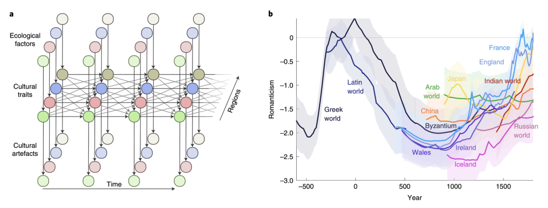 图4. 量化评估经济发展和文化传播在爱情演变中的作用。(a) 代表爱情重要程度的文化特质 (Cultural traits),在每个地区都是经济生态因素 Er(t) 和其它地区文化特质扩散基础上演变的。区域间文化传播取决于连接程度,爱情文化作品数量取决于当时产生地区的爱情水平。(b) 从公元前800年到公元1800年十个地区的爱情演变轨迹。