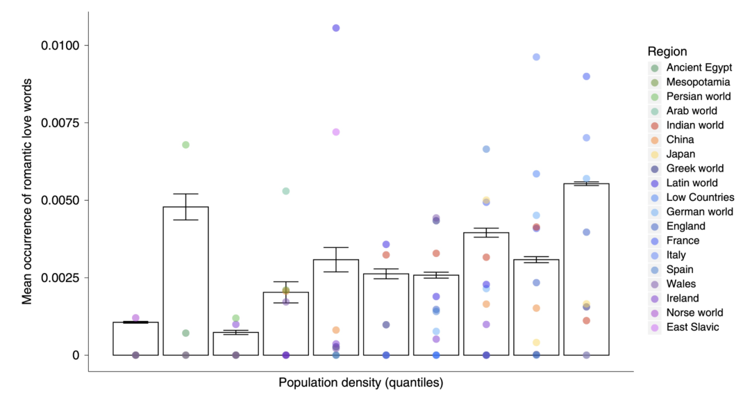 从文学作品历史流变看,两河流域和古希腊是早期爱情提到频次最高的地区,爱情故事原型是一个从西欧逐渐向东传播的过程。不过,最近一项对文学史上的爱情定性和定量的研究却表明,浪漫之爱远不是一个西方现象:相对于文化传播因素,经济发展水平起到了更重要的作用。