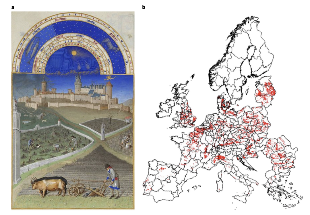 图3. 重犁的发明使人们有可能更深入耕作像黏土这样更肥沃的厚土,从而提高了经济收入水平。右边是欧洲适合重犁耕作的土地地图。