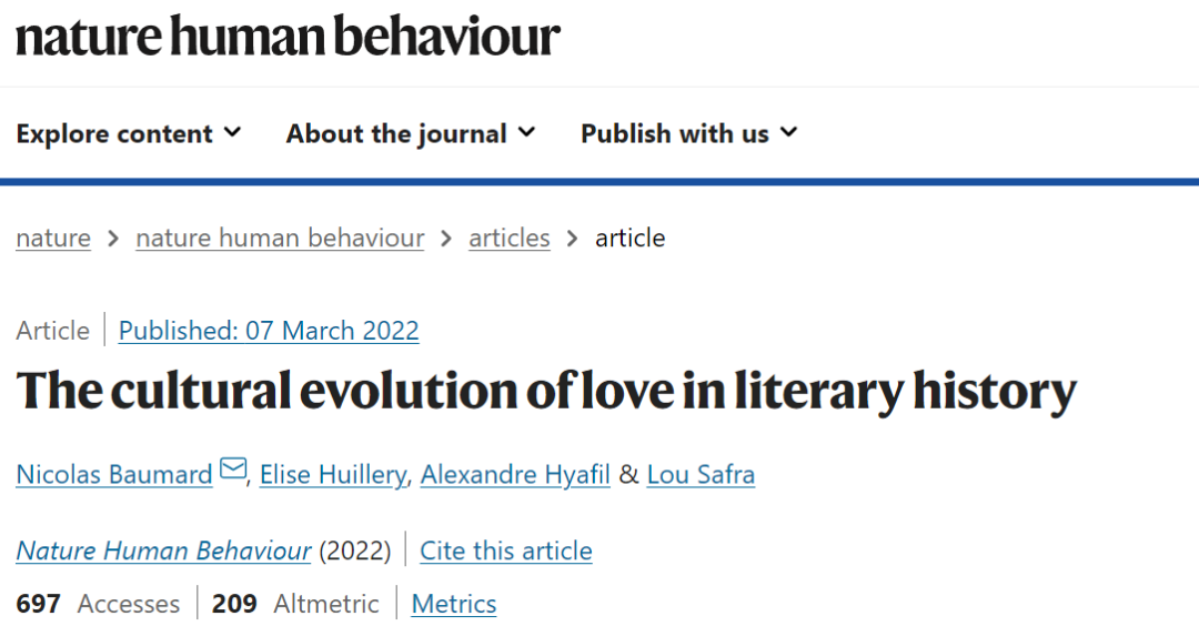 自19世纪末以来,文化历史学家就注意到,爱情元素在中世纪和现代欧洲早期文学作品中的重要性提高了。然而,根据最近的文学作品数据显示,中国、阿拉伯、波斯、印度和日本也出现了类似的增长。为什么在截然不同的国家文化中,会有如此相似的演化趋势?近日,Nature Human Behaviour 的一项最新研究通过定性和定量的方法,建立了一个覆盖3800年和77个历史时期(从青铜时代中期到现代早期)、19个地理区域的古代文学小说数据库,研究了爱情在文化史中的演变,结果表明:经济发展水平越高,叙事小说中的爱情元素出现频率就越高。