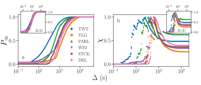 图1. 分别展示了渗流强度(a),相应的磁化率(b) 和时间分辨率的关系。不同的颜色代表不同的社交媒体。子图都使用最优分辨率对横坐标进行了归一化。