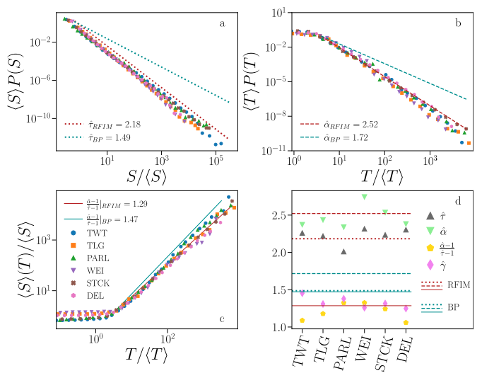 进一步,使用最优分辨率计算雪崩的规模S和持续时间T,并刻画它们的分布(如图2a,2b),发现不同的数据集都表现出了一致的行为,并且也成功验证了时间T和规模S之间的关系(如图2c),再次验证这种普适过程的存在。