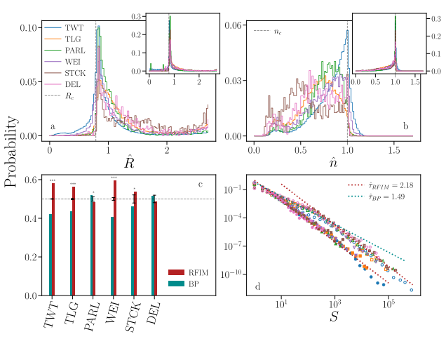 图3. (a) 是RFIM的结果,(b) 是BP的结果,竖直的虚线代表模型的临界值所在。(c) 是对数似然的占比概率,蓝绿色表示BP比RFIM更好的时间序列,红色则表示相应时间序列用RFIM更好。(d) 根据 (c) 的分类方式,将时间序列明显区分成两种不同的行为(这里仅取靠近临界点附近的时间序列作为对应分类的代表),并计算对应序列的雪崩规模分布。实心点代表使用的模型是RFIM,空心点是BP。虚线对应的分别是两种模型的最佳幂指数拟合。