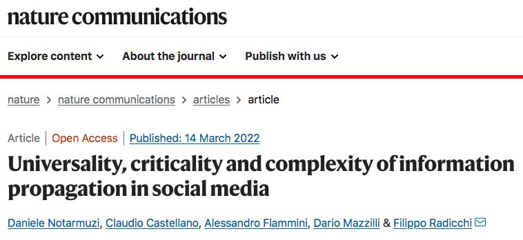 关于社交媒体上出现“信息雪崩”统计定律,至少目前为止还没有一个在各个系统都表现得足够鲁棒的实证研究。而对于信息传播来说,完全不同的过程很可能背后存在着合理的驱动机制。最近在 Nature Communications 上发表的一篇文献,分析了来自Titter、Telegram、微博等社交平台的近亿个时间序列,超过将近10年的时间窗口,展示了社交媒体上的信息传播过程的普适性和临界性。其中普适性体现在,无论具体系统的细节如何,我们都可以在不同的系统上观察到宏观尺度的统一模式;临界性则来自于信息雪崩持续时间和规模的幂律分布,相应的超规模关系(hyperscaling relations)。文章在数据上的统计检验指出,社交媒体上信息传播过程是简单传播规则和复杂传播规则的结合,并且还指出这个过程的复杂性和传播信息中包含的语义内容有关。