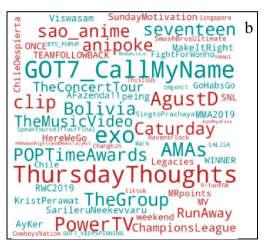 图4. 展示了不同分类下,Twitter 数据占比前30个的标签内容。蓝绿色是更符合RFIM模型的序列标签,红色是更符合BP模型的序列标签。标签大小表示占比排序。