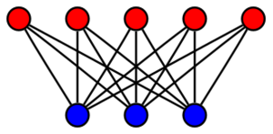 在一个完全二分图中,分别由m和n的顶点(用Km,n表示)组成的两个不相交的集合U和V,连边E由分别在集合U和V的两个顶点连接。该二分图表示为G =(U,V,E),并且具有mn条边。另外完全二分图还有一个特例,那就是 冠图 Crown graphs。冠图是将一个完全二分图中所有的完美匹配连边去掉后形成的。