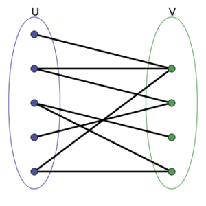 在图论的数学领域中,二分图 Bipartite graph(或二部图)是一个曲线图,其所有顶点可以分为两个互不相交且独立的集合U和集合V,并且邻边(无向或有向)的两个顶点分别属于集合U和集合V。通常集合U和集合V被称为该二分图的子集。同时,二分图中不包含任何形式的奇数环,即:集合U和集合V构造的点集所形成的循环圈边数不为奇数。