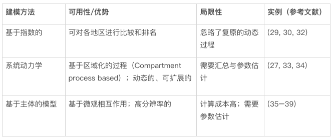 尽管DROP框架已经对复原能力进行了复杂的、动态的概念化,但在该研究之后,还是有大量的研究在使用静态的指数来衡量社区的复原能力[29, 30]。这种基于指数的(Index based)方法试图使用预先定义的测量清单,包括生态、社会、经济、制度和基础社会变量,来量化社区的固有复原力。然而,这种基于指数的方法有三个明显缺点:(1) 基于指数的方法没有考虑到灾后恢复过程中,城市社会、物理、制度和自然组成部分之间复杂的相互依赖关系(反馈和级联效应);(2) 该方法没有考虑到复原的动态过程,这可能会忽略城市系统潜在的关键阈值(如参考文献[31]所示);(3) 该方法难以验证和测试。为了将这些内在复原力的测量,与恢复过程中的其它因素(包括社会-技术-自然的相互依存关系、先决条件、冲击特征和适应能力)充分联系起来,人们已经提出并测试了多种建模方法(总结于表1)。尽管在动态复杂城市系统的复原力建模方面,已经有了这些进展,现有的研究的校准与测试时基于的数据集较小,通常来自家庭调查或次级数据来源(如人口普查)。