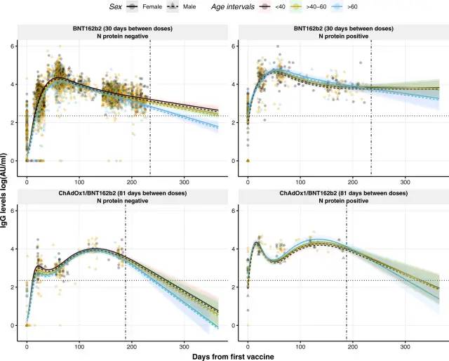 图:使用非线性模型得到的第一剂COVID-19疫苗接种后针对蛋白受体结合区域(RBD)的循环lgG含量的变化与预测。以log(AU/ml)表示随时间推移(从第一次接种开始的天数)的IgG含量分布。(左上)以前未被感染并且注射两剂辉瑞疫苗,两剂疫苗间隔30天。(左下)以前未被感染并且注射混合疫苗(ChAdOx1/BNT162b2 ),两剂疫苗间隔81天。(右上)先前被感染并且注射两剂辉瑞疫苗,两剂疫苗间隔30天。(右下)先前被感染并且注射混合疫苗,两剂疫苗间隔81天。圆圈和三角形分别代表女性和男性的循环lgG抗体的检测水平。实线和虚线分别代表由模型计算的女性和男性循环lgG抗体的预测水平。黑色、黄色和蓝色分别代表年龄<40岁、40-60岁和>60岁的个体。水平黑色虚线代表检测阳性的阈值。垂直的虚线表示根据已知样本所预测的趋势开始的时间。阴影区域代表95%的置信区间,其中心是预测(平均)值。