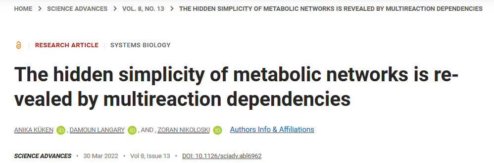 论文题目:The hidden simplicity of metabolic networks is revealed by multireaction dependencies 论文来源:Science Advances 论文链接:https://www.science.org/doi/10.1126/sciadv.abl6962