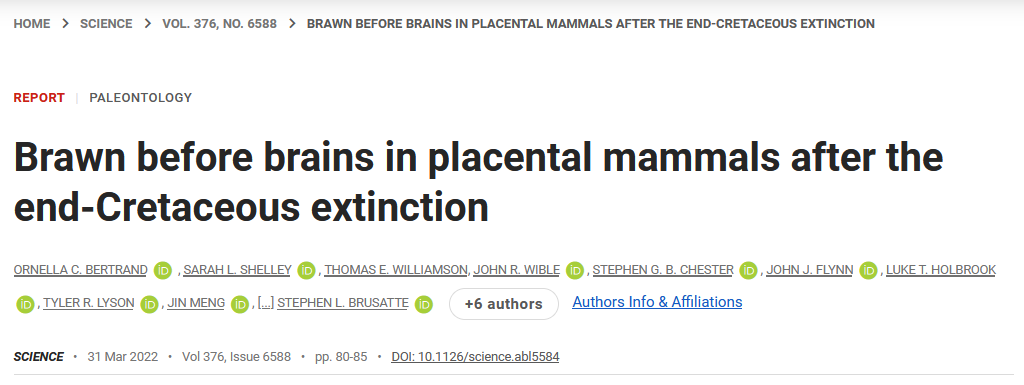 论文题目:Brawn before brains in placental mammals after the end-Cretaceous extinction 论文来源:Science 论文链接:https://www.science.org/doi/10.1126/science.abl5584