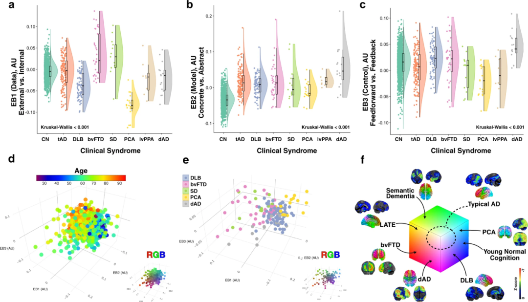 图:在正常衰老和七种临床痴呆病症中的人脑特征向量(eigenbrains, EB)。(a)(b)(c) 的三张雨云图分别为认知正常的淀粉样蛋白阴性老年人(cognitively normal amyloid negative individuals, CN)与七种神经退行性疾病的三组人脑特征量结果;(d) 的散点图展示了以三组特征量构建的三维模型中,最年轻个体(蓝点)与最年长个体(红点)处在相反的极端,右下角RGB颜色映射图也印证了这一点;(e) 的散点图突出了五种痴呆病症与临床综合征在多方面的差异映射与功能映射相吻合,右下角RGB颜色映射图同样得证;(f) 为研究中各种神经退行性疾病在构建的三维模型中的空间位置RGB颜色映射图以及临床解剖位置。