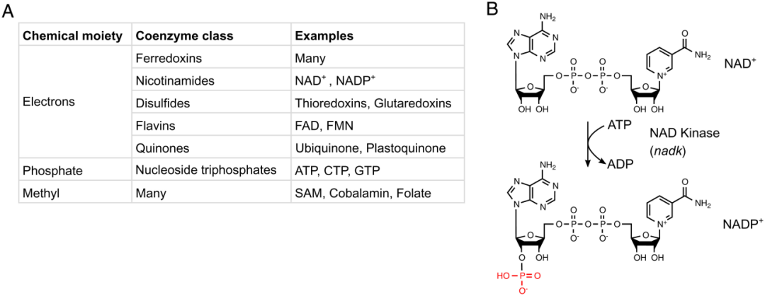 图:辅酶冗余是一种普遍的生物现象。(A)各类辅酶冗余的例子列表。(B)烟酰胺腺嘌呤二磷酸酯(NAD+)和磷酸化衍生物(NADP+)的结构。