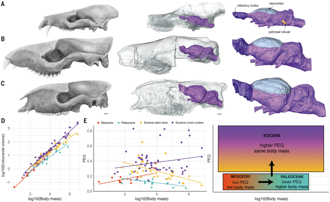 图:研究中使用的新生代哺乳动物的虚拟内模,突出显示了感觉区域,以及中生代和新生代早期哺乳动物的系统发育的广义最小二乘法(PGLS)回归。