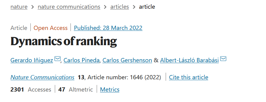 论文题目:Dynamics of ranking 论文来源:Nature Communications 论文链接:https://www.nature.com/articles/s41467-022-29256-x