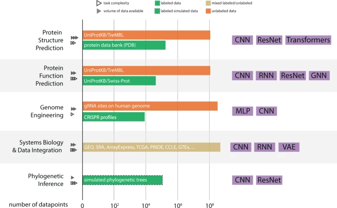 图:计算生物学领域几大问题中主要涉及的标记与未标记数据集,及这些领域应用的深度学习架构小结。