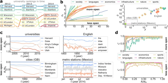 图:自然界和社会中的排序显示了它们动力学的一般模式。(a)根据ARWU得分,全球大学的年度最佳排名。(b)左图,所研究的系统在时间t内的排序周转率 ot,定义为相对于列表大小 N0而言,到t为止在排序列表中出现过的元素数量Nt。右图,平均周转率和平均流量F(一个元素进入或离开列表的平均概率)之间的相关性。排序列表形成一个连续体,从最开放的系统(F, o∼1)到较不开放的系统(F,