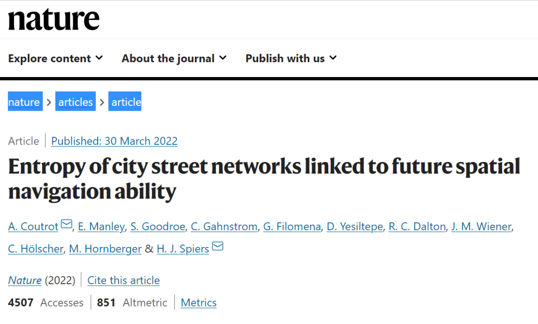 论文题目:Entropy of city street networks linked to future spatial navigation ability 论文来源:Nature 论文链接:https://www.nature.com/articles/s41586-022-04486-7