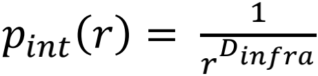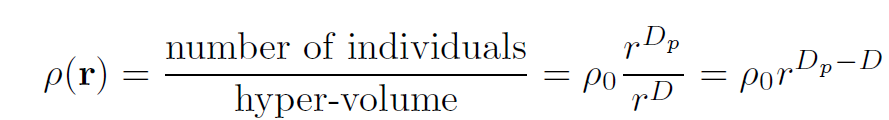 ,其中衰减指数γ是模型的一个参数,用于测量相互作用范围。该模型还认为,人口空间分布形成了一个分形结构,其分形维度为Dp,嵌入到一个具有欧氏维度D的超体积中(保持Dp≤D),因此可以将ρ(r)写为: