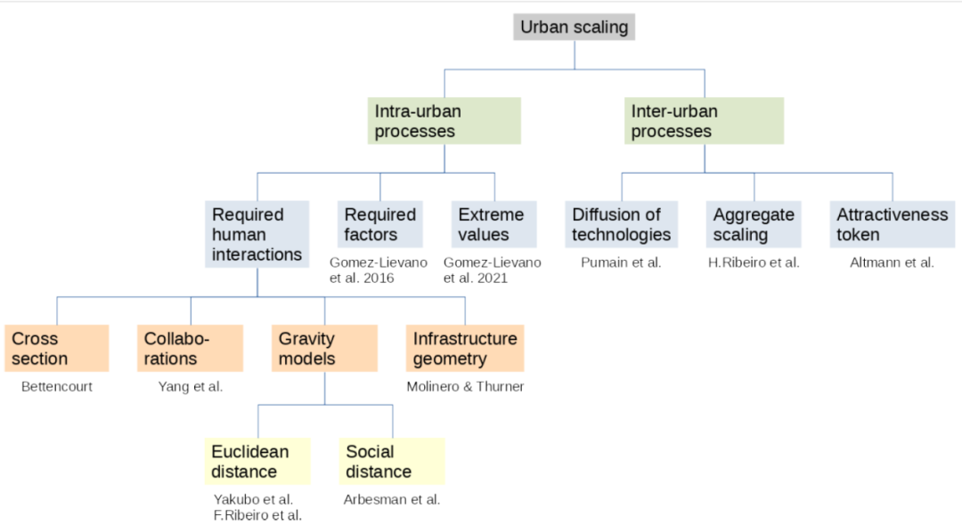在过去的几年里大量的工作认为城市变量取决于人口规模N,而没有必要纳入其他变量或甚至来自邻近城市的信息。事实上,这背后的主要想法是,城市变量的结果只是城市内部过程的结果。然而,城市之间是不断互动的,城市指标对人口规模的依赖可能仅仅是一个成功的一阶近似表现。这一节使用城市的内生因素介绍了城市标度律起源的数学模型,此处将城市内部的模型分为两类。第一类考虑了人与人之间的互动,以解释非线性的城市标度律。第二类则认为当城市中存在一些必要的补充因素时,就会出现非线性的城市标度律。