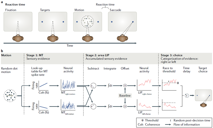 作为该处理流的一部分,MT神经元投射至外侧顶叶区域的神经元[37]。当向受试者展示运动证据时,外侧顶叶区域的神经元显示出一种刻板的上升活动模式,该模式在眼球运动开始之前逐渐增强,以指示运动的方向[29]。该活动已被建模为将证据整合在一起,以决定运动的方向[33]。尽管这些发现最近受到挑战[38,39],但该研究计划仍然很好地阐述了谢灵顿模型对认知的解释。