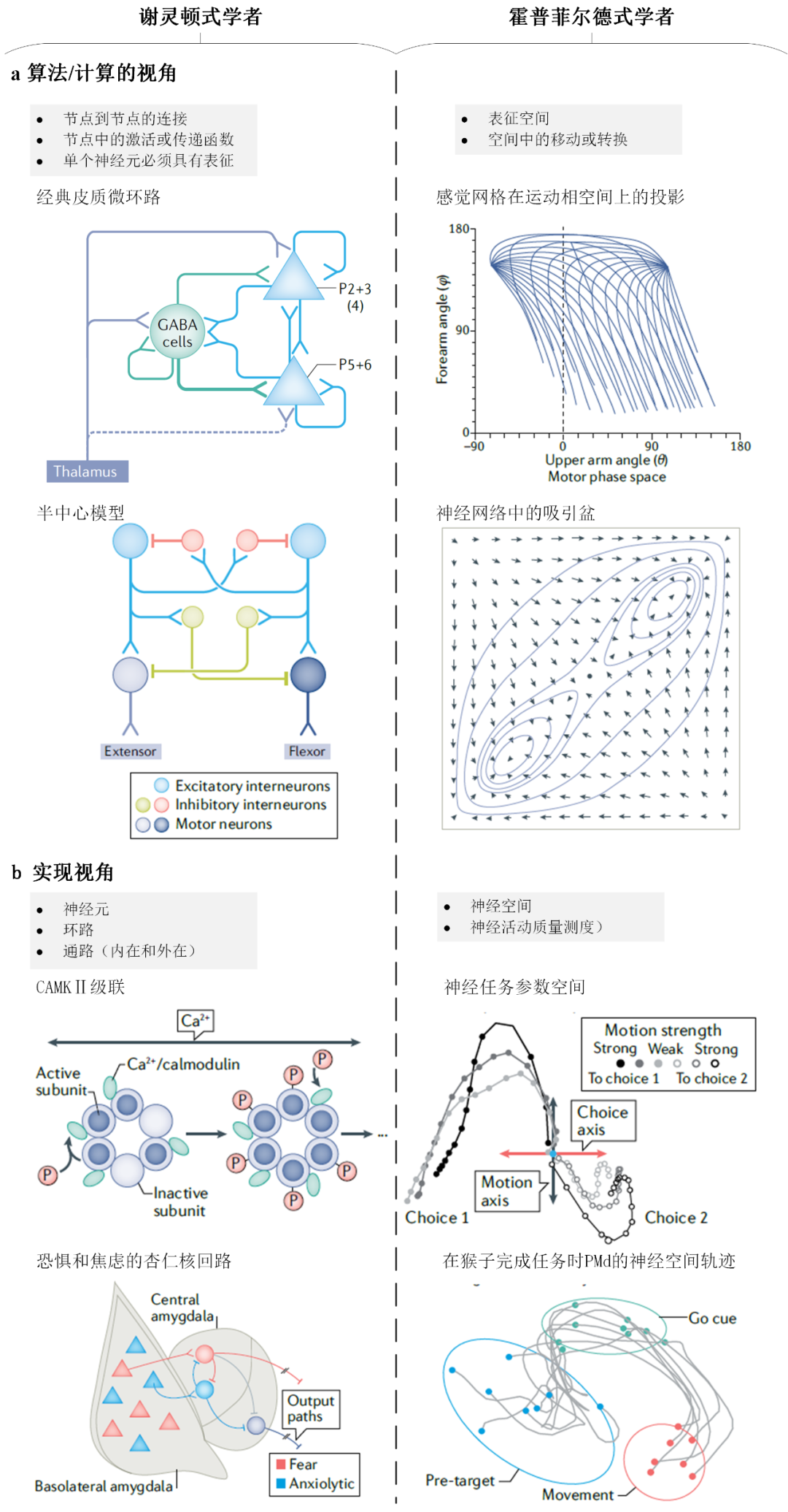 图1:谢灵顿式观念和霍普菲尔德式观念的对比和比较。谢灵顿式观念和霍普菲尔德式观念的概述。谢灵顿式观念探求将认知解释为点到点结构中节点的信号转换,而这些节点以及之间的连接与大脑中嵌入在回路和通路中的神经元相对应。在算法/计算层面上,谢灵顿式观念(a部分,左图)把节点到节点连接的特定模式的结果解释为认知,在这里单个节点转换表征。这种特定模式的一个例子就是经典的皮质微回路模型(图1顶部),在该模型中,皮质第4层神经元中锥体神经元(P)接收到的输入被转换和投射到第2/3层然后再传递到第5/6层。第二个例子就是反射的半中心模型(图1底部),在该模型中,兴奋性中间神经元和运动神经元表现出与中间神经元的刻板连接以实现相互抑制和交叉抑制。在实现层面,谢灵顿式观念(b部分,左图)详细描述了神经元、回路以及细胞内和细胞外通路,从而在算法/计算层面实现这些回路。比如,细胞内的 CAMKⅡ级联是由于自磷酸化而在细胞内持续活跃的分子级联。杏仁核中恐惧或焦虑的特定回路涉及基底外侧和中央杏仁核之间不同模式的神经元连接,每个情感过程都有专门的输出路径。