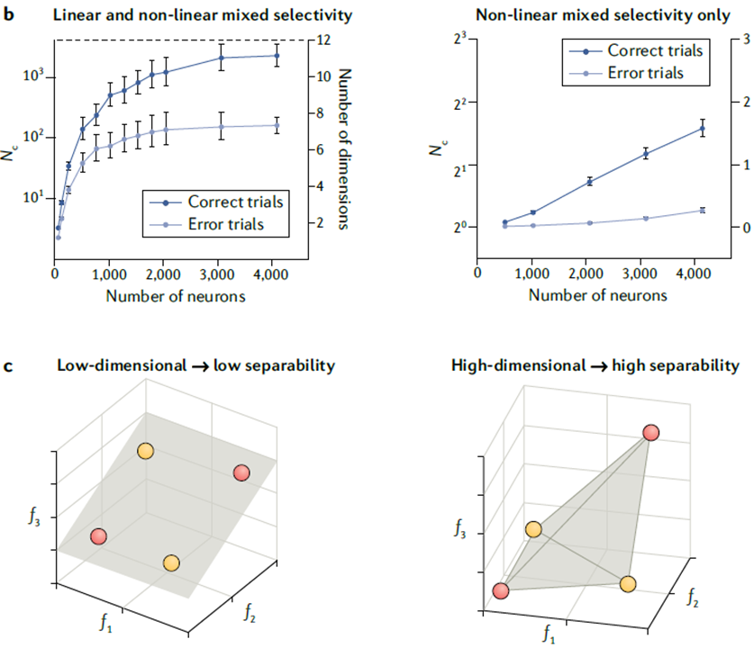 b.表征空间的维度(即维数)与神经元的数量相关以及试验的正确与否。这种维度是群体特征并且不能简化为单个神经元;因此,这种解释不适用于谢灵顿式观念。左图:在一系列群体规模中,正确的试验比不正确的试验具有更高维度。x轴表示分析中使用的神经元数量位,左侧y轴表示二元分类数 (Nc) 。二元分类数是被正确分类的任务条件数量,即在给定性能阈值(阈值在75-80%之间[78])的条件下,训练的分类器正确分类(1表示条件C,0表示非条件C)的数量。是一个分类器可以被训练以对正确分类的给定性能阈值进行分类的任务条件的数量。右侧y轴上的维数是二元分类数的对数函数。右图:与左图一样,但删除了每个神经元的线性作用。与错误试验相比,正确试验仍然表明维数有增加。