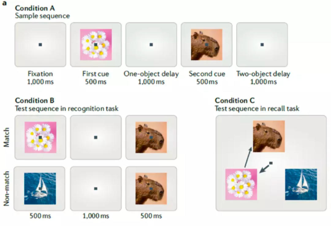 a.延迟匹配示例任务。条件A:任务的样本试验序列。猴子首先注视方块中心1,000ms,然后展示一个示例图像500ms,在延迟1,000ms后,展示第二个图像500ms,然后是第二个 1,000ms的延迟。之后要求猴子根据任务以不同的方式做出反应。条件B:识别任务序列。在条件A的第二次延迟之后,猴子会看到第二种两个图像的序列。第一个图像展示500ms,延迟1,000ms后,展示第二个图像500ms。当第二个图像序列与条件A中的原始序列一致时,就会发生匹配;当第二个图像序列与原始序列不一致时,匹配就会失败。猴子必须指出第二个序列是否匹配。条件C:回忆任务序列。在条件A的第二次延迟后,展示三个图像,要求猴子须按照显示的顺序选择条件A中原始序列显示的两个图像。