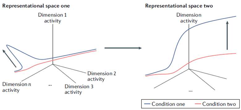 与谢灵顿式观念相反,霍普菲尔德式观念强调神经系统中认知计算的分布式特性,正如Hopfield描述的分布式神经网络如何执行计算一样[50,60-65]。该方法以神经空间之间的转换来表示其操作和表征。在实现上,神经元的集中活动由一个神经空间描述,在其中嵌入了一个低维表征流形[66]。这些神经空间可能由神经集合[50,67,68]、大脑区域[67,69]或整个大脑的分布表征[70]组成。这些表征和转换是通过神经元或其子成分的聚合作用实现的,但对认知的解释不需要包括对神经元或其详细相互关系的生物生理学描述。单个神经元只能作为认知现象的二级解释器发挥作用,仅通过它们对神经空间的影响来解释。极端情况下,霍普菲尔德式观念完全避开了单个神经元的细节[71]。