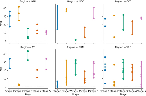 图2. 从不同区域的交通指数节点传出的网络加权入度的小提琴图。纵轴的加权入度(weighted in-degrees, WID)表示该城市从其他城市接收雾霾,横轴中的区域依次为京津冀(BTH)、东北(NEC)、成渝经济圈(CCS)、华中(CC)、粤港澳大湾区(GHM)和长三角(YRD)。