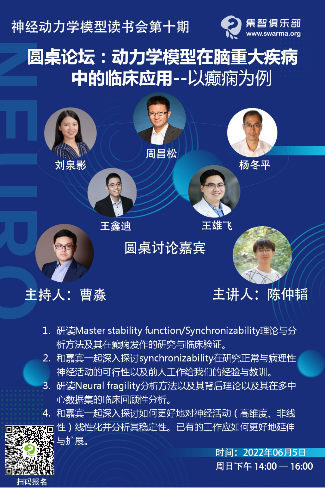 癫痫发作是高同步、高波幅的病理性神经活动,具有复杂的时间-空间演化模式,并且难以预测、难以干预。同时,人类癫痫发作的机制并不明确,因此为我们的研究带来了很多困难。前人对癫痫发作的动力学性质研究发现:即使癫痫发作电生理信号表现出高同步性,相比于正常背景活动(更多地表现出随机性),癫痫发作的动力学性质或许存在系统变化。动力学系统的稳定性分析或可更好地刻画癫痫发作前或发作中的系统性质变化,并通过维护或破坏系统稳定性,提供外科干预、神经调控与发作预测策略。本期读书会将系统研读多篇临床数据与神经动力学结合的文章(详见参考文献),并邀请神经动力学与临床研究领域的多位老师,通过圆桌讨论的方式,深入探讨如何更好地将动力学分析与临床数据相结合,怎样避免可能存在的陷阱与问题,有哪些前人的经验与教训我们可以从中吸取。