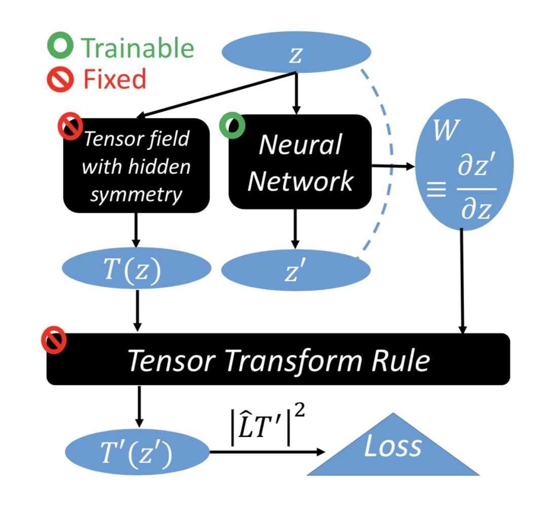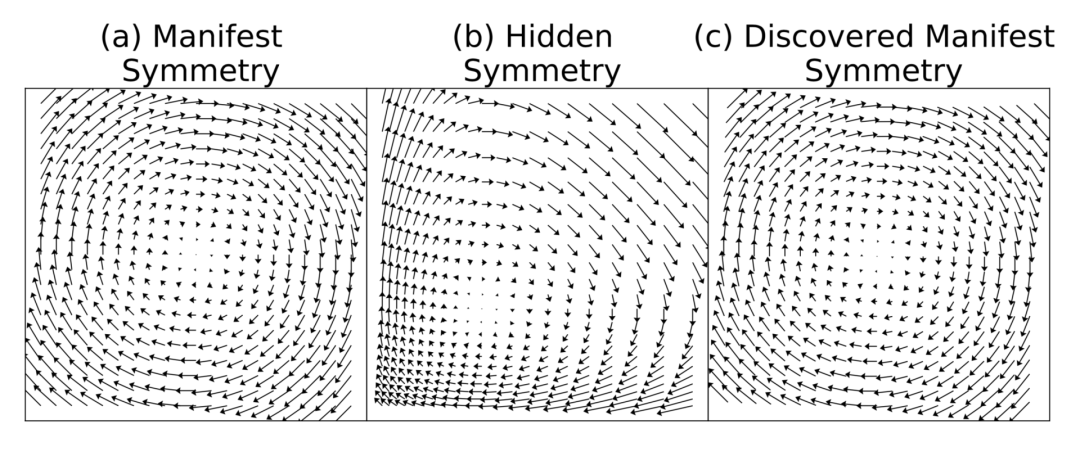图1:一维谐波振荡器相空间流矢量场 f(x, p) = (p, -x)。f 的旋转对称性在(a)中显现出来,在(b)中是隐藏的。算法可以通过自动发现从(b)到(c)的坐标转换,来揭示隐藏的对称性。