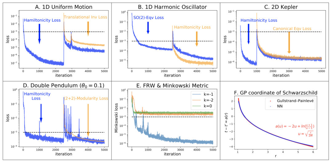 图3:研究人员的算法发现了六个测试系统中的所有隐藏对称性。最后一张图显示,神经网络准确地学习了Gullstrand-Painleve变换。