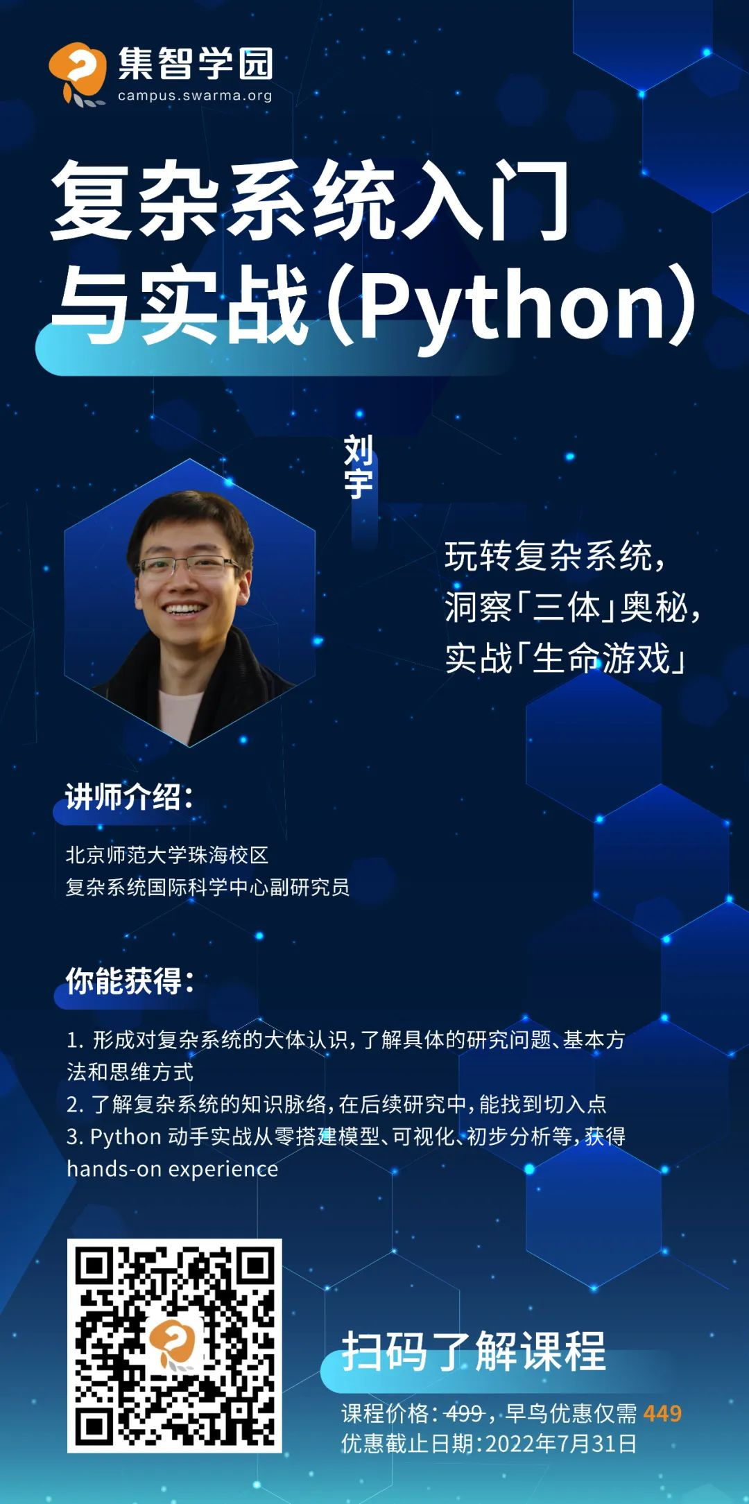 欢迎对复杂系统感兴趣的你,欢迎加入《复杂系统入门与实战(Python)》课程!付费学员可加入课程交流群,另外,还将在2022年10月31日前,提供作业批改、交流、答疑等服务。