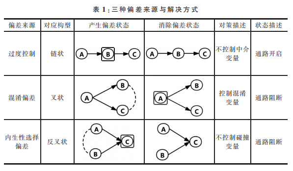 (1)通路中存在一个被控制的混淆变量或中介变量(对应表1中“混淆变量的消除偏差状态”和“过度控制的产生偏差状态”);