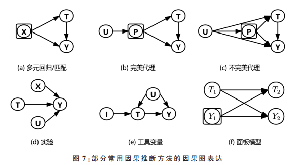 当系统中存在无法直接观测的因素时,如果这些因素的涵义比较明确,最直接的方法是寻找替代变量。如在社会科学研究中,经常使用考试成绩代表个体的认知能力,使用自评心理状况量表代替心理健康程度等。然而,如果代理变量不能完全反映对应的因素,仍会有部分混淆偏差遗留在系统中,如图7(b)(c)所示。