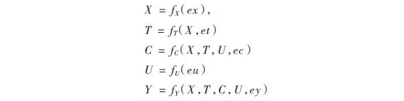 现实中的因果情境往往包含诸多相关变量,若将所有变量都纳入因果图,不仅节点庞杂,更兼箭头繁复。那么,哪些变量需要纳入因果图中,哪些变量可以适当省略,是否存在相应的判别法则呢?首先需要指出,因果图中的某个节点代表的可能是由多个变量组成的变量矩阵而非单个变量,如图1中的X节点,置于特定社会学问题下,可作为个体性别、种族、年龄等先赋性人口学变量的统一指代,这些变量不需要再逐个标注于因果图中。其次,对于因果图中涉及的变量应当在何处“适可而止”,仍需回归到其背后的数学表达来看。如图1中右图所示,实际上在珀尔的设计中,每个变量背后都有一个对应的代表着因缺失其他变量所致的误差项e。这些缺失的变量相对于因果图中包含着的其他变量边际独立,对应的误差项e代表着在考虑因果图中相关变量之后该变量仍不能被解释的部分。换言之,对因果图中包含的特定变量,图中其他与该变量相关的变量加上该变量自身对应的误差项e就可以完整涵盖该变量的信息。图1中各变量对应的数学表达为: