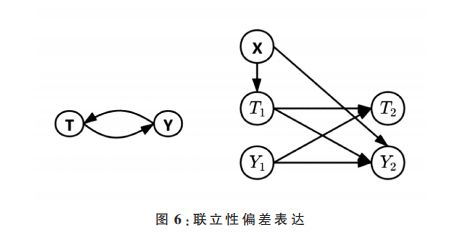 陈云松、范晓光曾在研究中谈及第四种偏差是因联立性或双向因果而产生的。前文已提及,真正的“因”与“果”之间必然存在时间的先后次序,所谓的两变量X和Y互为因果,其真实涵义是“X能对随后发生的Y产生影响,反之Y也能影响到随后发生的X”。也就是说,联立性偏差源于数据的精细程度不足而无法区分出变量发生的次序,根本的解决方法是引入更精细的时间次序。在开环有向形式的因果图中不允许两变量之间存在双向箭头,但可以通过在变量后添加角标来表示时间次序。如图6左侧所示,代表着直观上“联立性”的左图与“开环”的要求不符,因而不会出现在因果图中;图6右侧部分则通过加入角标的方式,将同一变量细分为不同时段。尽管干预T和效应Y互有影响,但只是体现在T1对Y2和Y1对T2的作用上,处在同一阶段的T1与Y1,T2与Y2之间并不存在直接的因果作用。此外,同一变量在不同时间段存在趋势延续性,因而T1向T2和Y1向Y2也存在箭头连接。需要注意的是,图中仅截取了变量在两个时间段的相互作用情况,更前面的时间段并未在因果图中呈现,真实的因果图状态应该是沿时间趋势以类似结构不断延伸的。加入时间角标后,因果图中通路的开闭规则仍然适用。就图6右侧部分来看,若评估T1→Y2的因果效应,则需要保持以下路径关闭:T1←X→Y2,T1←T2←Y1→Y2,T1←Y0→Y1→Y2,T1←T0→Y1→Y2(未显示于图中)。根据D分隔规则,这些路径均可通过控制X和Y1加以阻断。需要再次强调,因果图能够帮助研究者规划解决联立性问题的思路,但能否实现则取决于数据的质量。