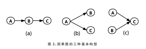 进而言之,无论多么复杂的因果图,均由三种基本构型所组成。其一为链状构型,如图2(a)所示,位于三个变量间的两处箭头线方向均一致,变量A通过中介变量B充当了变量C的“因”,对应到图1左图中,X→T→C,T→C→Y,U→C→Y均是典型的链状结构。其二为叉状构型,如图2(b)所示,即以同一个变量A为源头延伸出两条箭头线,同时指向另两个变量B和C,本文将其概括为“共因”结构。在此情况下,作为另外两个变量共同之“因”的变量A被称为混淆变量,在图1左图中,变量X对于T和Y、变量U对于C和Y而言均为混淆变量。其三为反叉状构型,如图2(c)所示,变量A与B分别有箭头线指向变量C,变量C即为A和B的“同果”,此状态下变量C被称为A和B两变量的碰撞变量。图1左图中除解释变量Y之外还存在一处碰撞变量,即作为变量T和U同果的变量C。