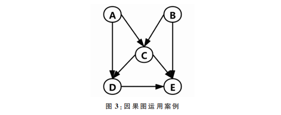 本文参考格林兰等人论文中一则因果图案例并解释运用D分隔的具体分析过程。如图3所示,假设D代表使用社会关系,E代表个体的收入,C为个人魅力,A为性格,B为相貌颜值。要测量使用社会关系是否影响到个体收入,需要排除除了D直接到E的因果通路之外其他所有通路的干扰。值得注意的是,此图中代表着个人魅力的变量C本身是解释变量D与被解释变量E的混淆变量,又是个体性格A和相貌B的碰撞变量,而性格和相貌又与变量D和E相关。那么,要想测量出D和E之间的因果效应需要控制哪些变量呢?首先罗列D和E之间所有非因果通路共计四条:(1)D←A→C←B→E,(2)D←A→C→E,(3)D←C←B→E,(4)D←C→E。此时,个体魅力C在通路2、3、4中分别为中介变量和混淆变量,因而控制这一变量就能够阻断这三条通路。但问题在于,个体魅力又是通路1的碰撞变量,意味着当控制个体魅力后反而会开启通路1并带来新的偏差。因此,必须寻找通路1中的中介变量或混淆变量来阻断该通路,而个体性格A和相貌B均满足该条件。同时,由于变量D和E为直接因果关系,不存在被过度控制阻断的可能。因此,就图3而言,需要同时控制变量C和A,或C和B,或C、A和B才能满足非因果通路的D分隔条件;若只控制变量C会带来内生性选择偏差。