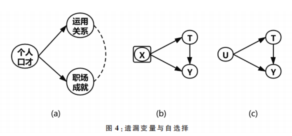 遗漏变量偏差指的是回归模型中存在本该被控制却未被控制的变量,与因果图中因混淆变量造成伪相关的情况相对应。陈云松、范晓光曾在研究中举例,在探讨找关系和职场成功间的因果效应时,因未控制个体口才导致推断存在偏差。基于因果图的框架不难发现,“个体口才”充当了混淆变量的角色。如图4(a)所示,根据经验推断,一个人的口才会影响其对社会关系的应用情况;同时,口才作为能力的一个维度,也会影响到个体是否能在职场上取得成功,这就形成了典型的叉状构型。此时,即使假设找关系与职场成功之间不存在因果关系,但如果不控制混淆变量“个人口才”,也会因未能阻断解释变量和被解释变量之间的伪相关而得出“找关系能够影响职场成功”的错误结论。