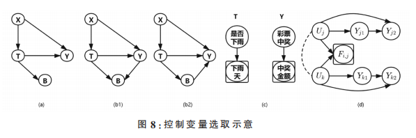 此外,值得澄清的一点是,仅基于解释变量或被解释变量一边做出的样本选择并不会导致偏差的产生。图8(a)中控制变量B的做法可被视为对解释变量T进行了选择,但由于这种选择与变量Y不产生直接的关系而不会影响到T与Y之间的因果效应,伍德里奇称此为外生性样本选择。不妨用一种理想化的极端情况进行说明:图8(c)中分别以是否下雨和彩票中奖为干预和效应,而这两者本身是不存在任何关联的。控制干预为“下雨天”不会影响彩票中奖的概率;控制效应为“中奖”的条件下,当天是否下雨也与具体的彩票获奖金额无关。现实情况中,基于解释变量或被解释变量的选择往往会对因果推断造成影响,其本质在于这些选择会以某种方式影响到另一边,而非真正的完全无关。
